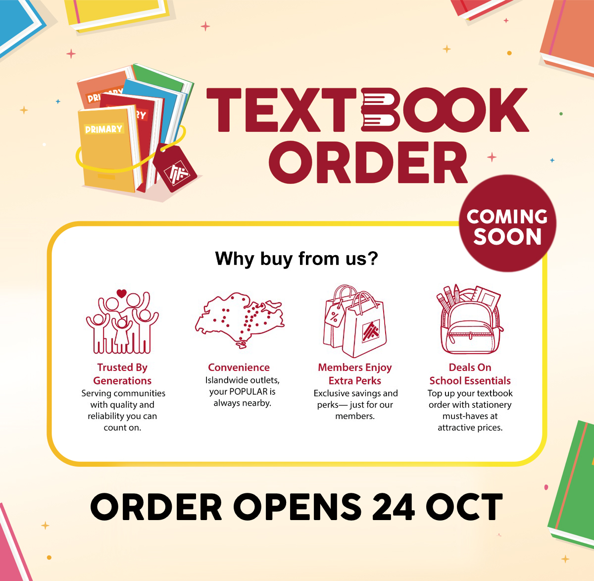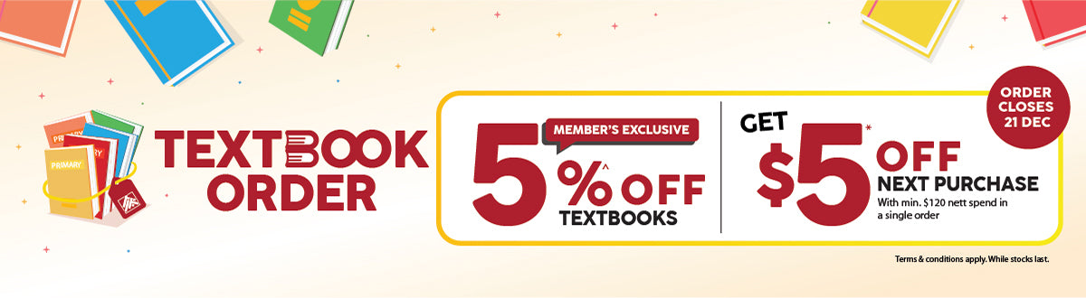*Promotion is valid from 24 Oct to 30 Nov 2025. Receive a $5 Cash Voucher for Textbook Store Pickup or a $5 Promo Code for Textbook Home Delivery with minimum $120 nett spend in a single order. $5 Cash Voucher and $5 Promo Code terms & conditions apply. ^Promotion is valid from 24 Oct 2025 – 11 Jan 2026, applicable at all POPULAR Bookstores. Present your POPULAR Card/e-Card to receive 5% OFF textbooks. Not valid with any other discount (POPULAR Card/e-Card, voucher and/or promotion) and nett-priced items. Other terms & conditions apply. While stocks last. Delivery charges apply for home delivery.